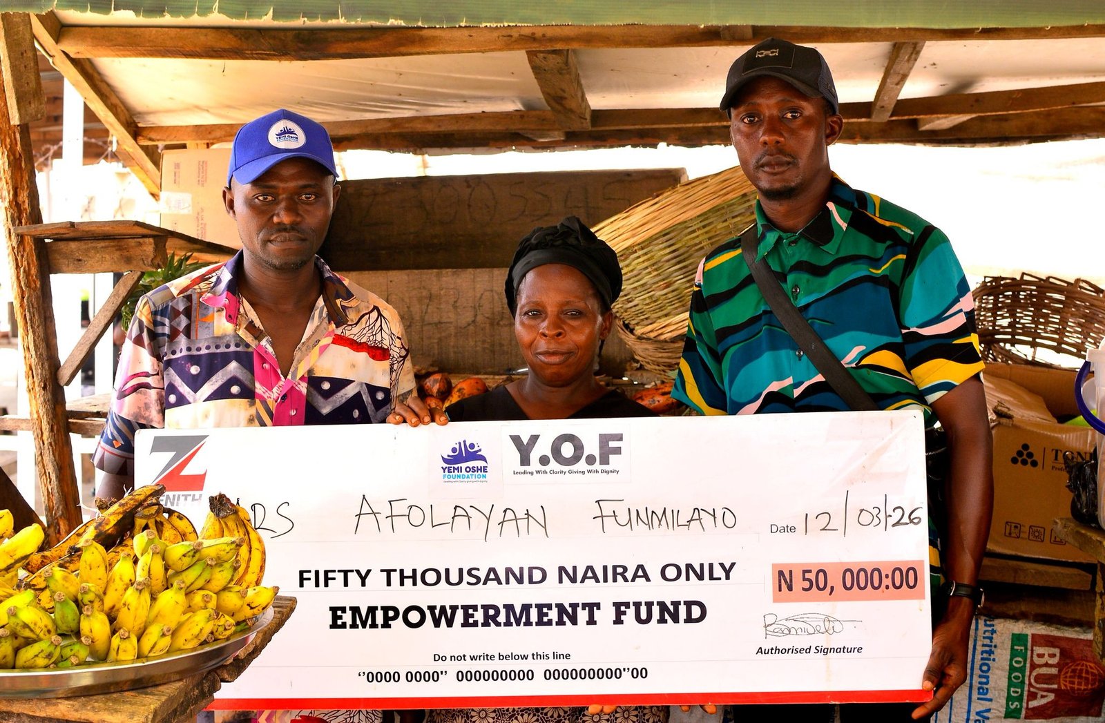 It was a moment of joy and gratitude in Ado Ekiti as the YEMI OSHE FOUNDATION surprised a local fruit seller, Mrs. Afolayan Funmilayo, with a cash support of ₦50,000 to boost her small-scale business.